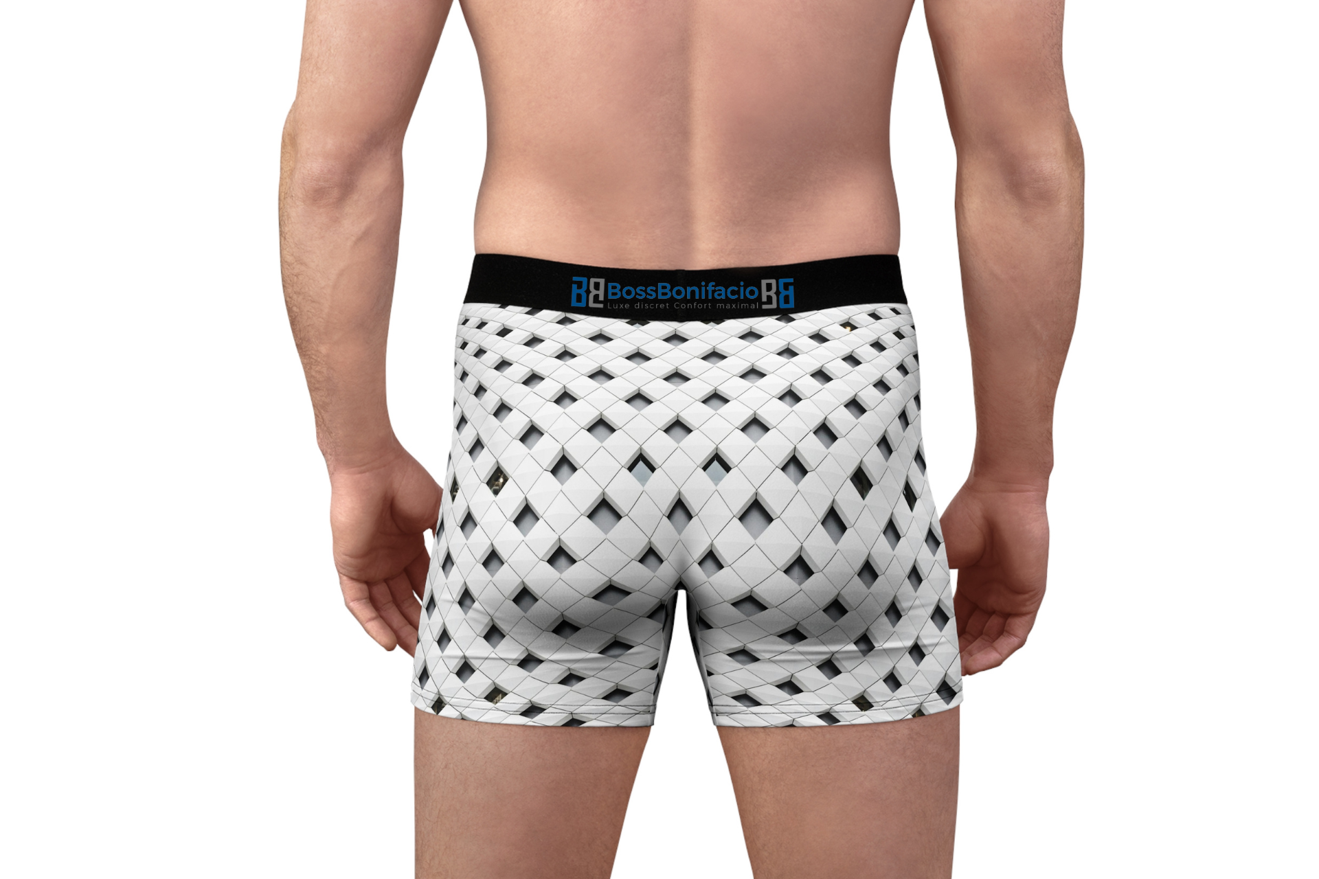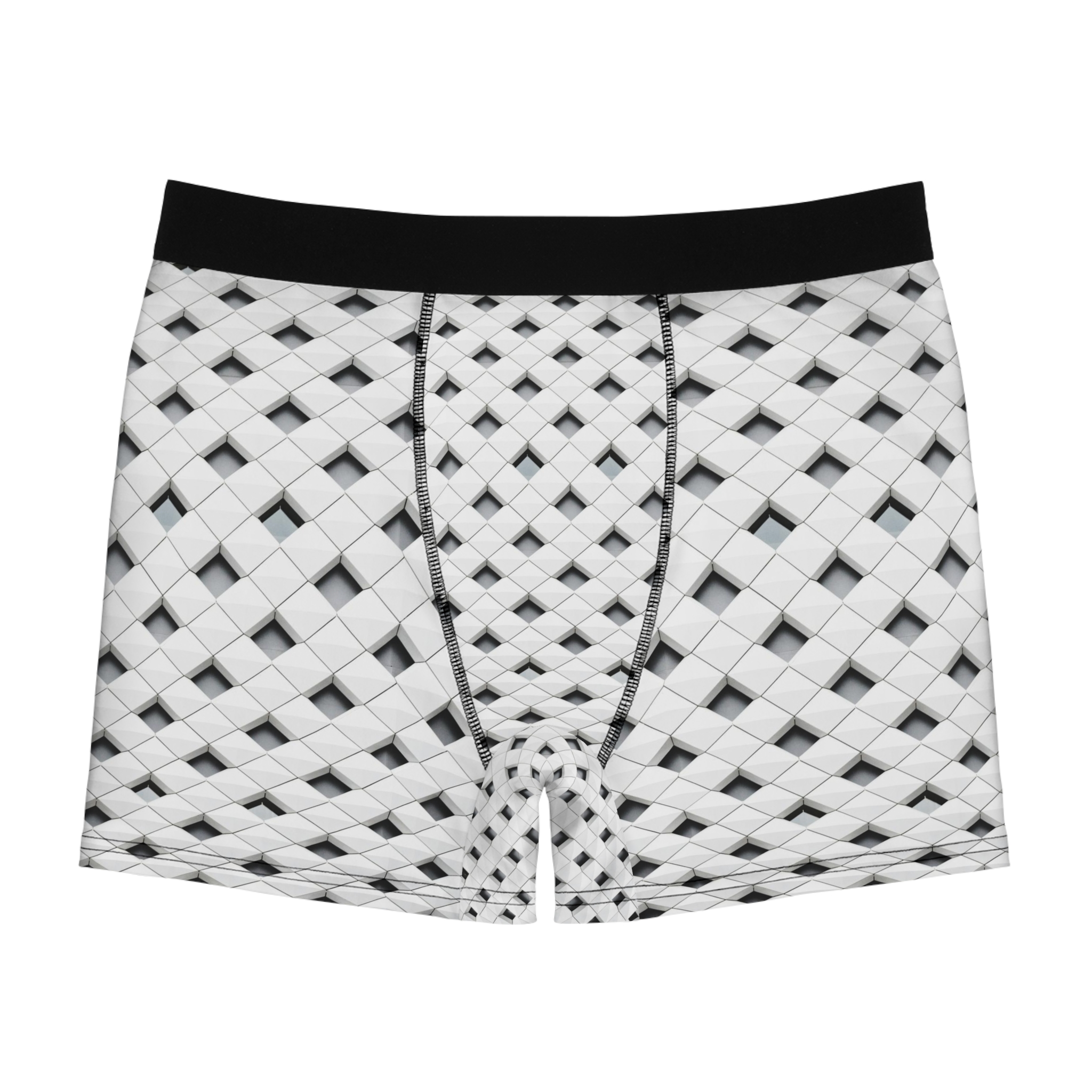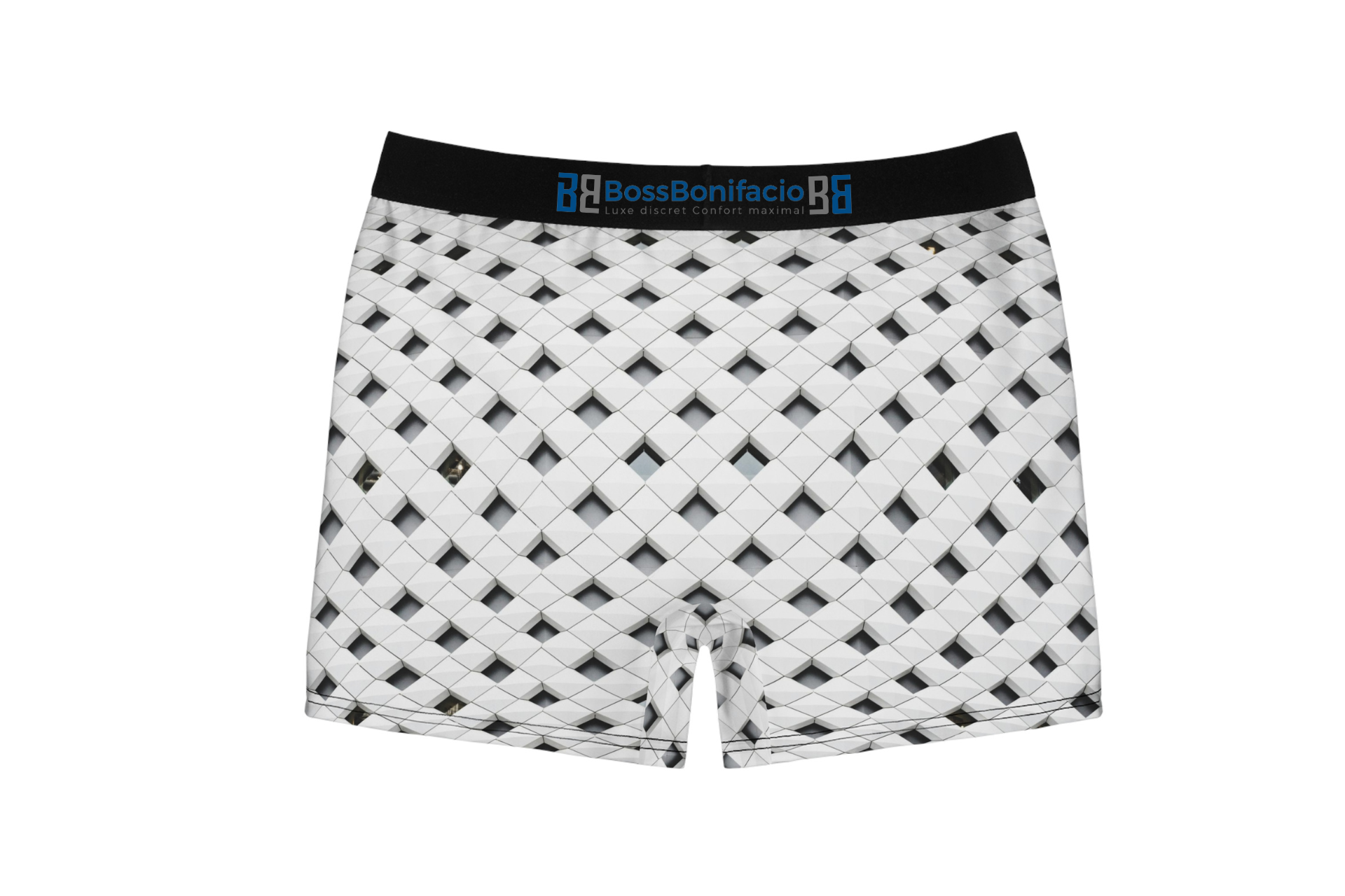Ce boxer blanc est doté d’une ceinture noire et d’un élégant motif géométrique noir. Le motif se compose de carrés, de triangles et de cercles disposés en tesselles qui couvrent tout l’avant du sous-vêtement. Le tissu est doux et respirant, et la ceinture est élastique pour un ajustement confortable. Ce boxer est un excellent choix pour la vie de tous les jours ou pour l’entraînement.
