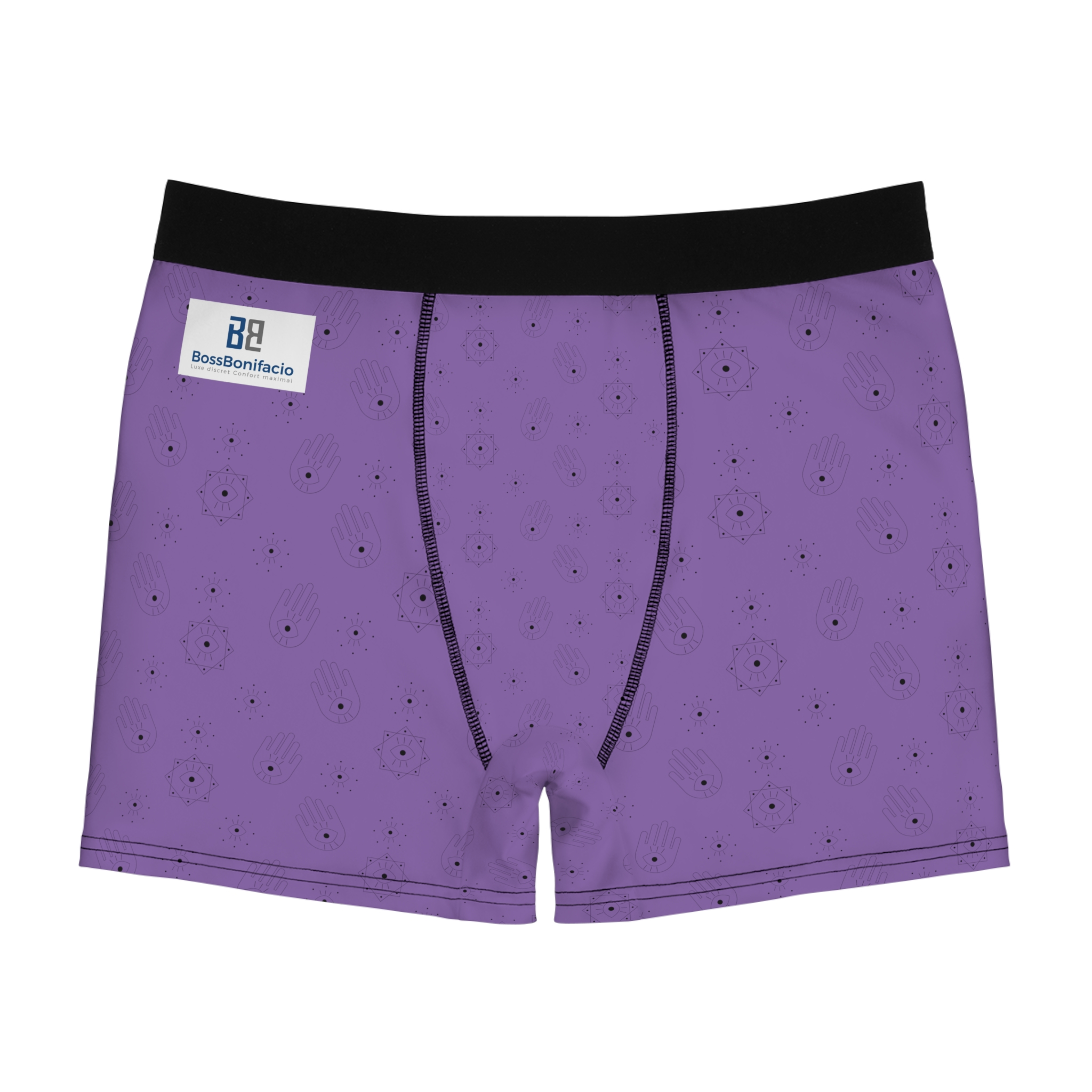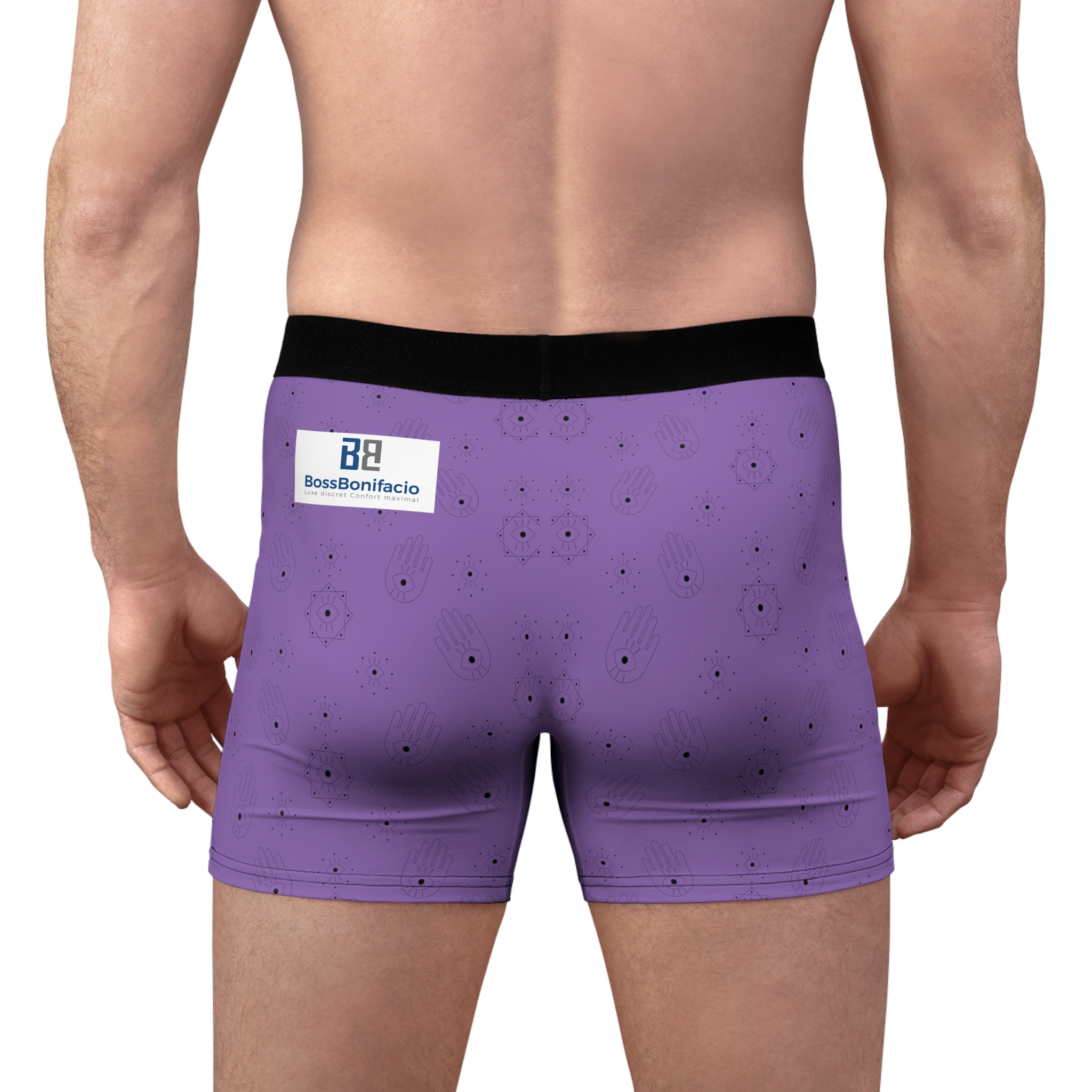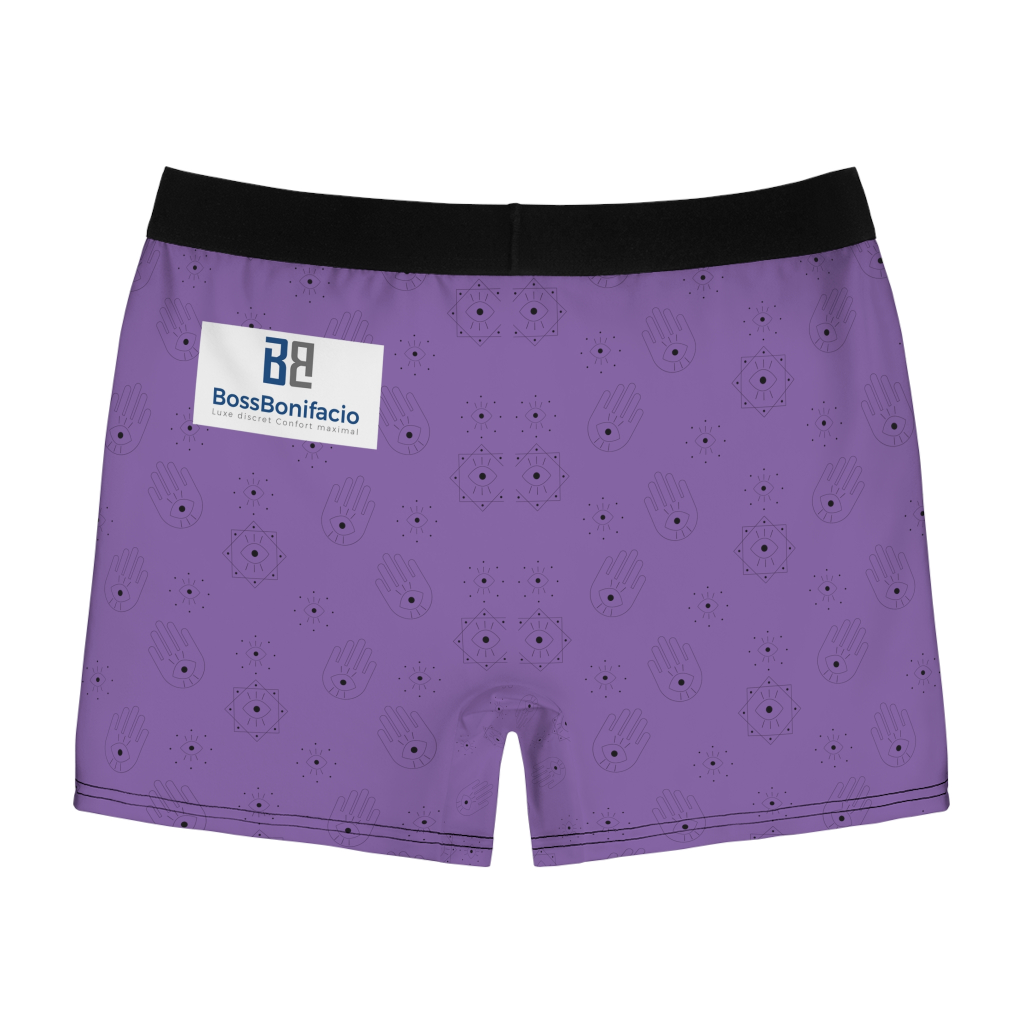Une paire de boxers violets avec une ceinture noire. Le boxer porte le logo de la marque « BossBonifacio » sur la ceinture.