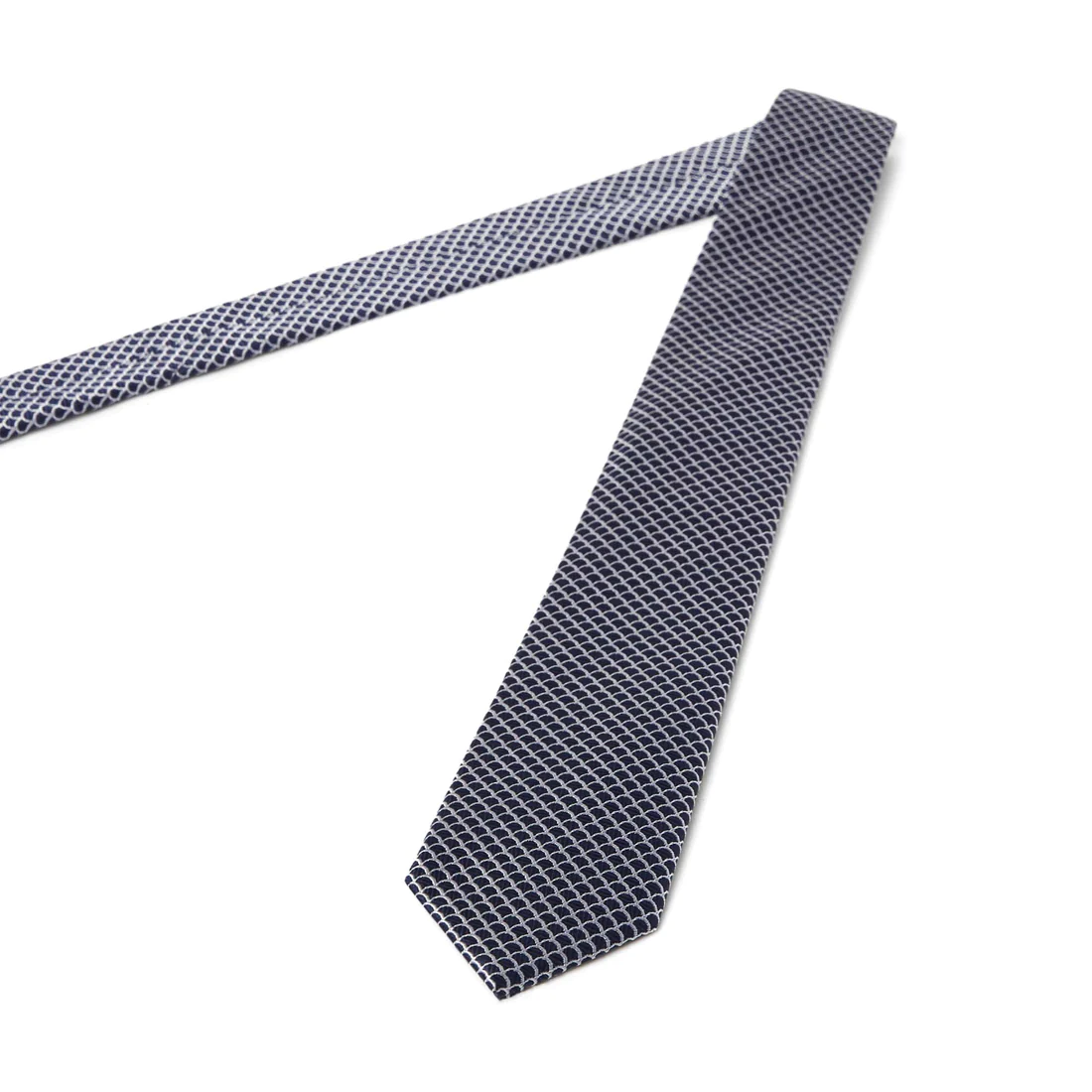 - Cravate à motif géométrique argent et marine.