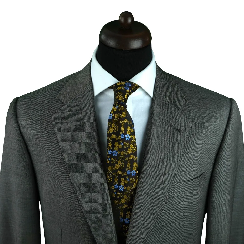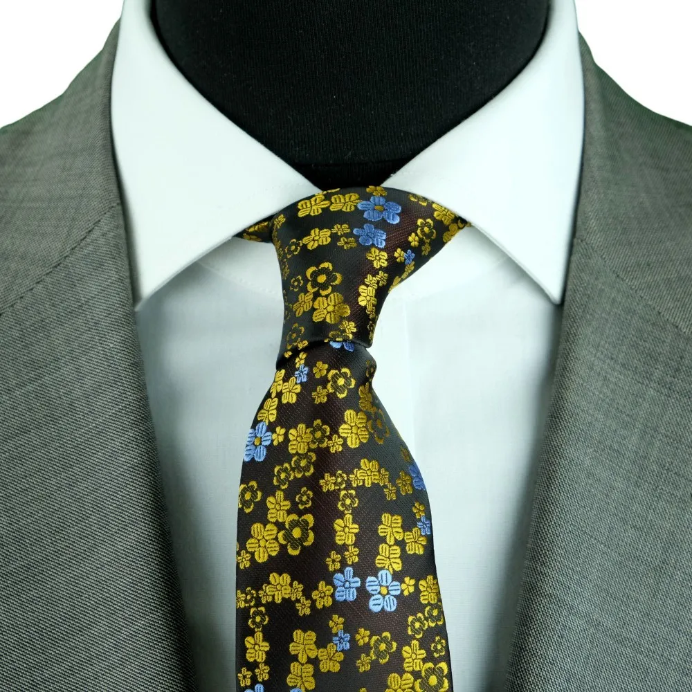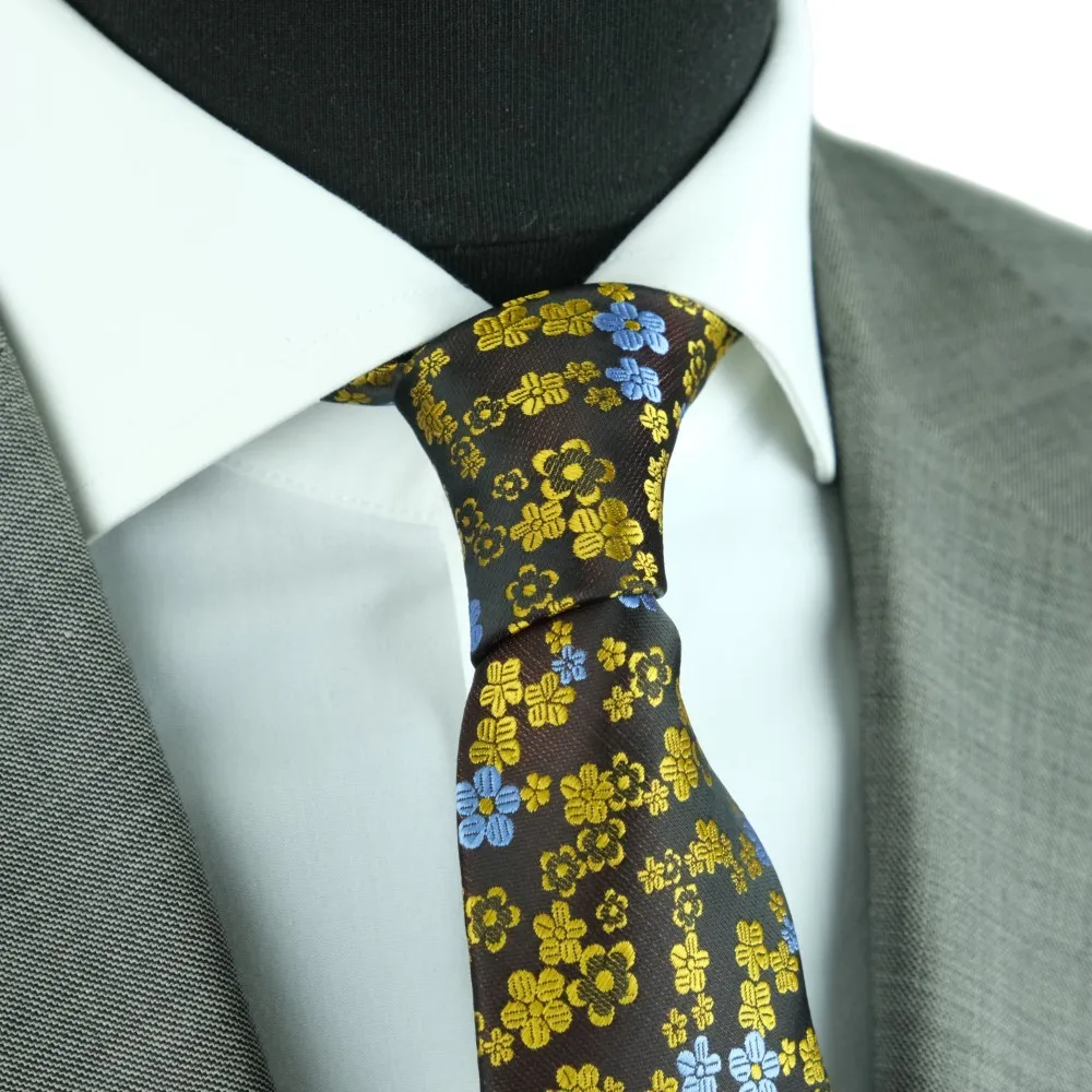 CRAVATE CLASSIQUE ATTORA. MARRON À FLEURS JAUNES ET BLEUES
