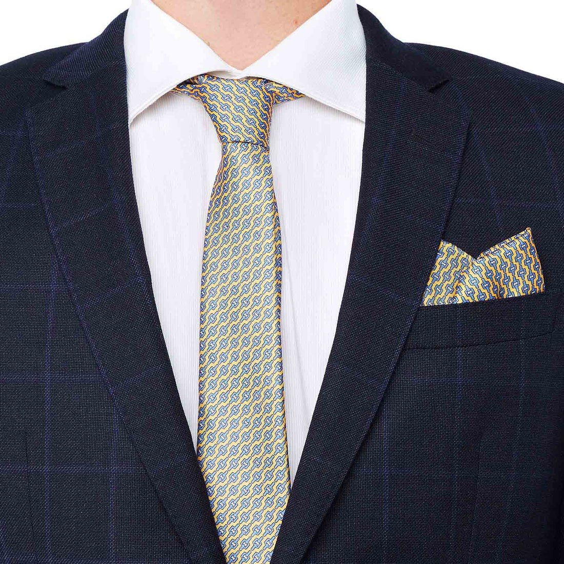 Ajoutez une touche de gaieté à votre tenue avec cette cravate dynamique à motifs noeuds jaune ! Son motif original et coloré égaiera votre costume tout en restant élégant.