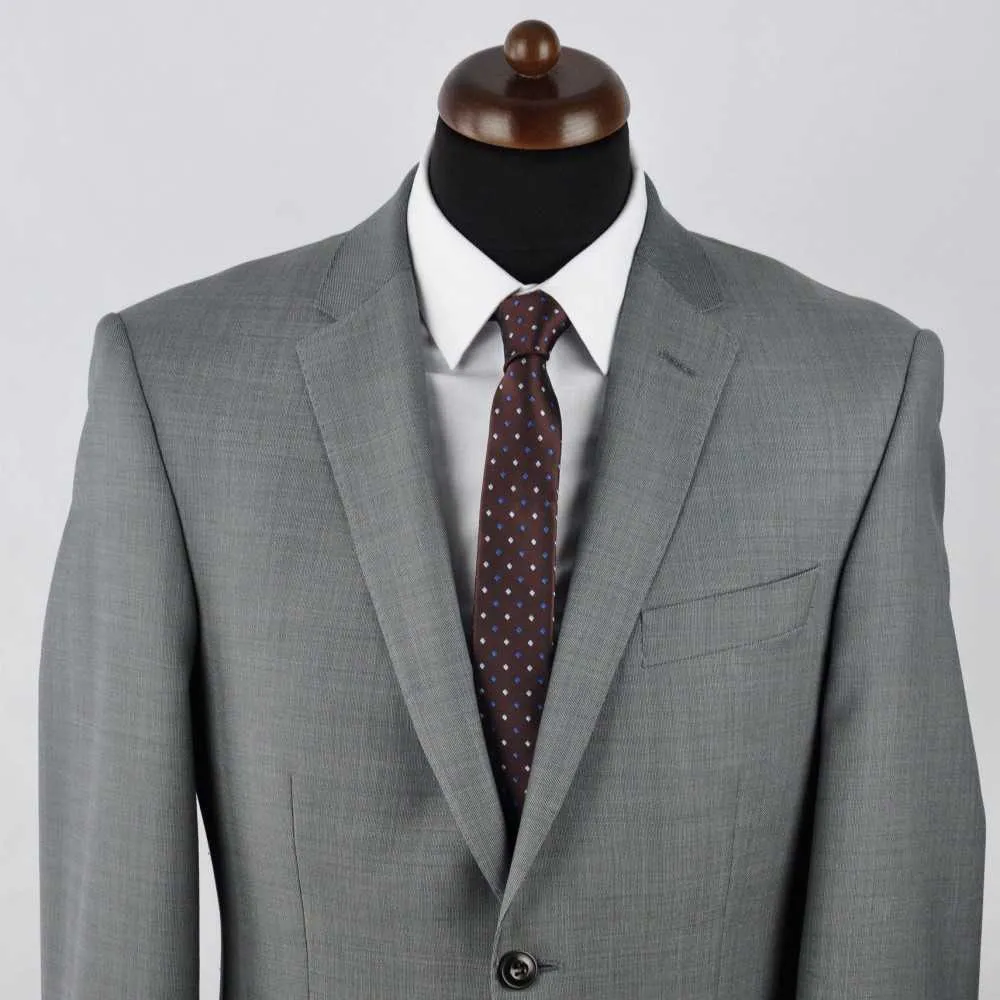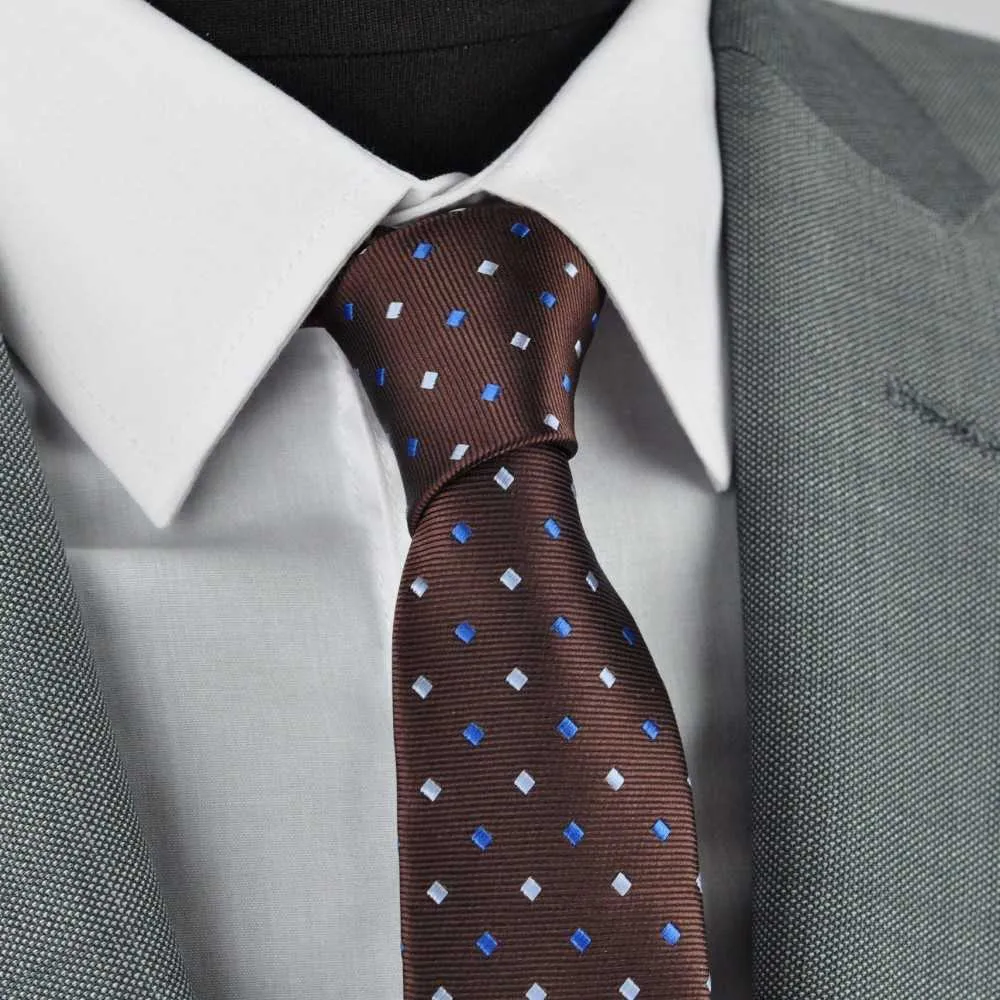 « Belle cravate ! » C’est ce que les gens vous diront. Leurs yeux ne peuvent pas ne pas remarquer votre cravate slim marron chocolat à motifs bleus.