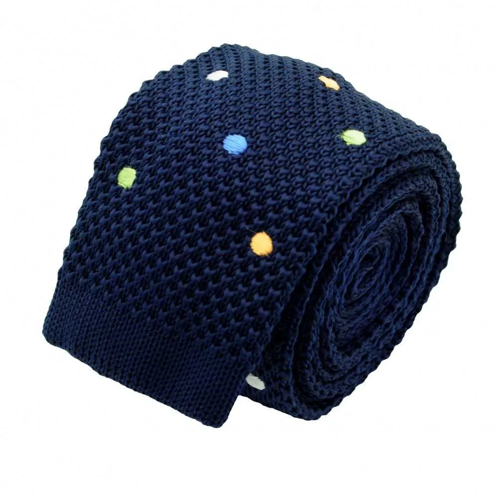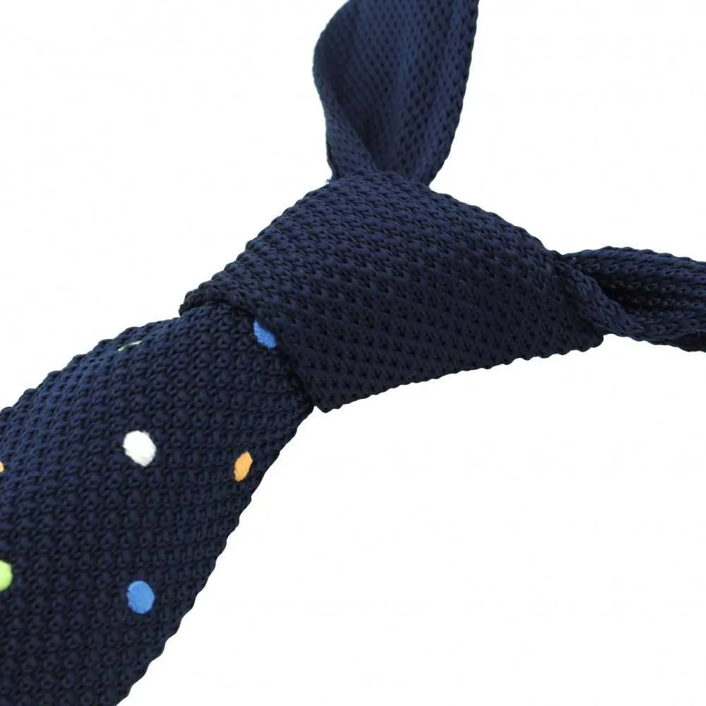CRAVATE TRICOT HOMME. BLEU MARINE À GROS POIS MULTICOLORES