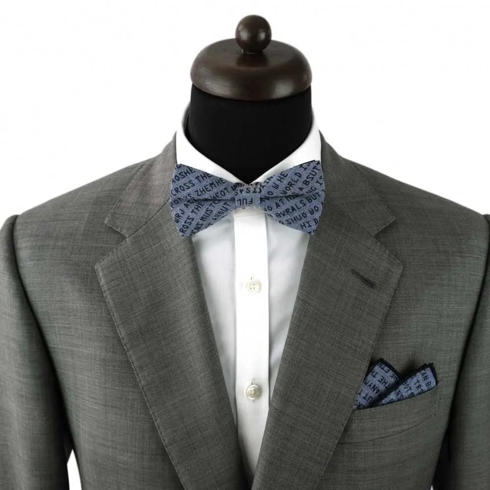 ENSEMBLE NOEUD PAPILLON ET POCHETTE HOMME EN COTON AVEC ÉCRITURE. BLEU