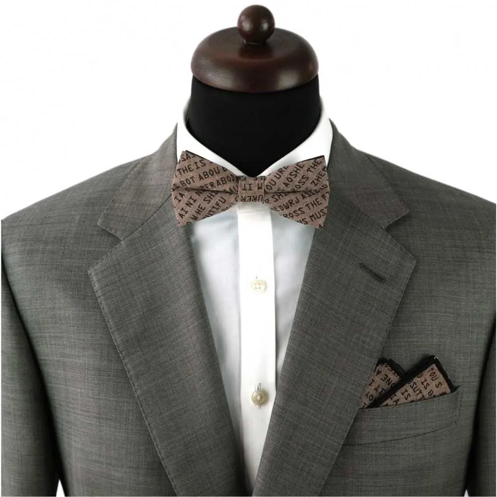 ENSEMBLE NOEUD PAPILLON ET POCHETTE HOMME EN COTON AVEC ÉCRITURE. MARRON