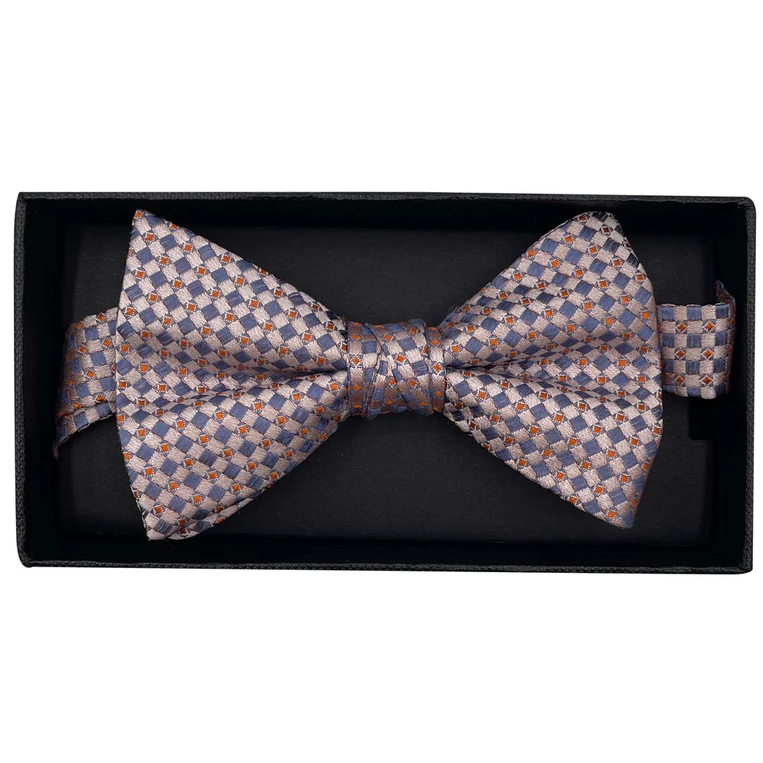 • Nœud papillon orange à motif quadrillé orange et bleu.