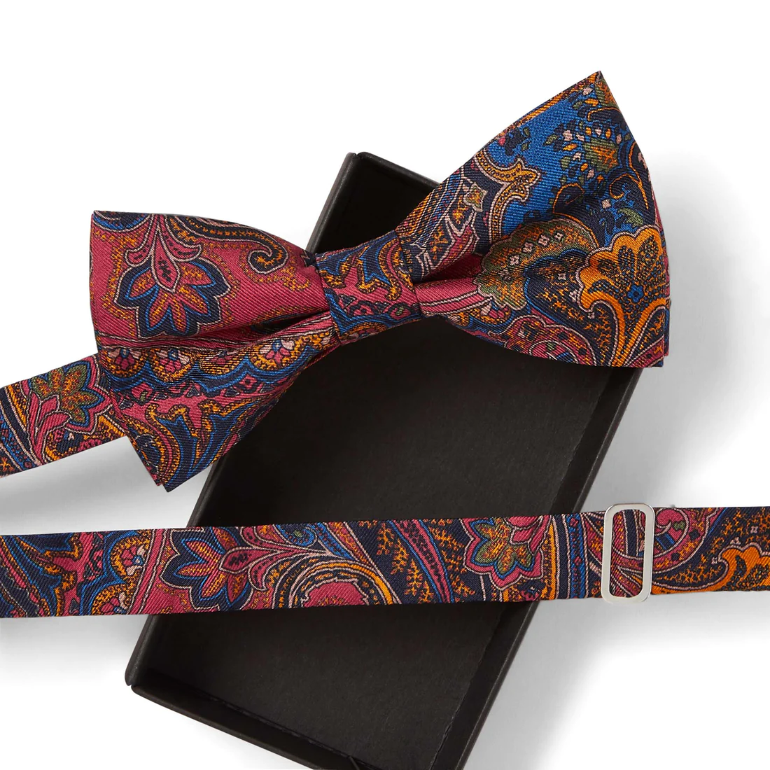 Tendance depuis plusieurs années, le nœud papillon est parfait pour accessoiriser une tenue. Vous pourrez le porter lors de cérémonies, mariages, repas de Noël ou d’anniversaires, cocktails chics… Cet accessoire 100% soie a été fabriqué en Italie. Notre nœud papillon en soie à motif Paisley bordeaux marine sera la touche finale qui apportera beaucoup d’élégance à votre look.